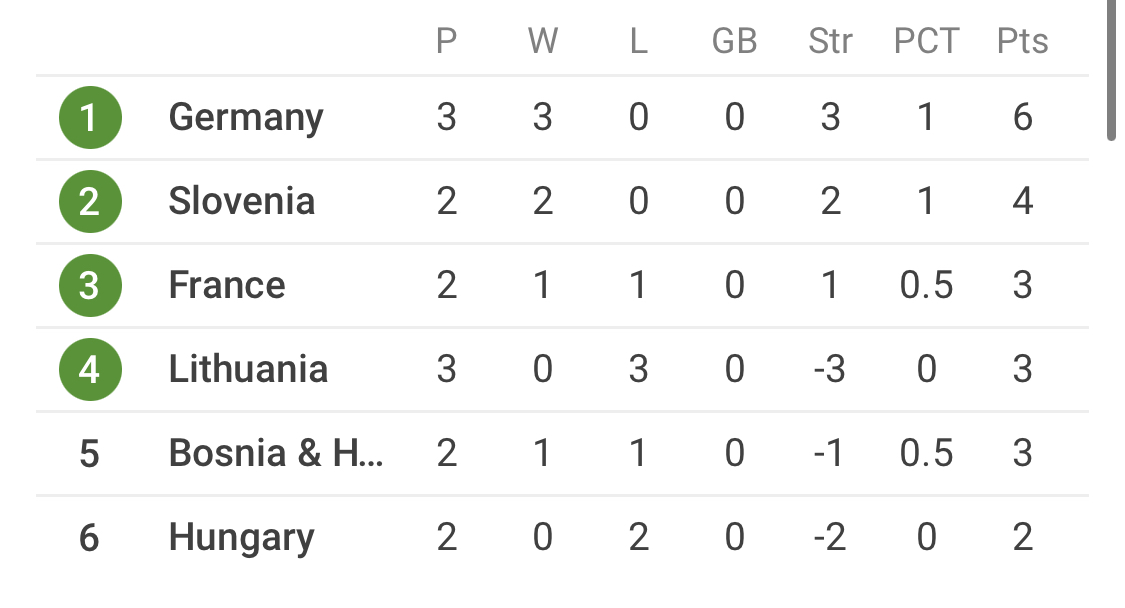 BiH sada nakon tri kola ima dvije pobjede i jedan poraz, a i Slovenija je na istom omjeru 2-1. Do kraja grupne faze Bosna i Hercegovina igra još dvije utakmice. Prvo ćemo u utorak igrati protiv Francuske, a onda u srijedu vjerovatno odlučujući susret protiv Litvanije.