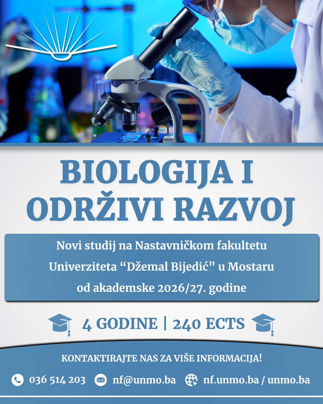 Studijski program Biologija i održivi razvoj je novi studij na Nastavničkom fakultetu Univerziteta „Džemal Bijedić“ u Mostaru. U fokusu ovog programa nalazi se održivi razvoj kao temelj budućeg društvenog i ekonomskog napretka, uz poseban naglasak na procese zelene tranzicije koji transformišu način na koji proizvodimo, trošimo i upravljamo resursima. Studenti se osposobljavaju da razumiju i aktivno učestvuju u prelasku ka održivijim sistemima, u kojima su zaštita okoliša, ekonomska efikasnost i društvena odgovornost u ravnoteži.