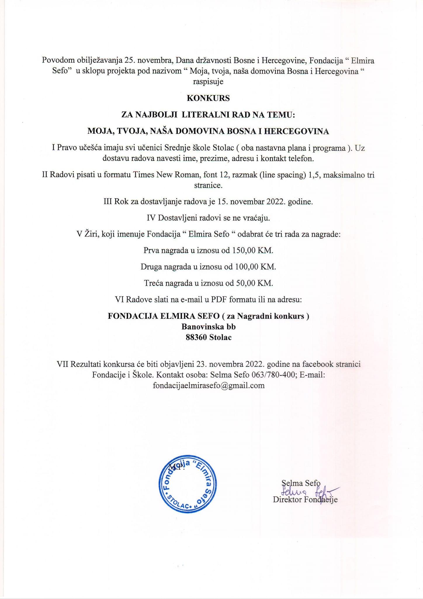 Povodom obilježavanja 25. novembra, Dana državnosti Bosne i Hercegovine, Fondacija “Elmira Sefo” u sklopu projekta pod nazivom “Moja, tvoja, naša domovina Bosna i Hercegovina” raspisuje konkurs za najbolji literarni rad na temu: “Moja, tvoja, naša domovina Bosna i Hercegovina”.