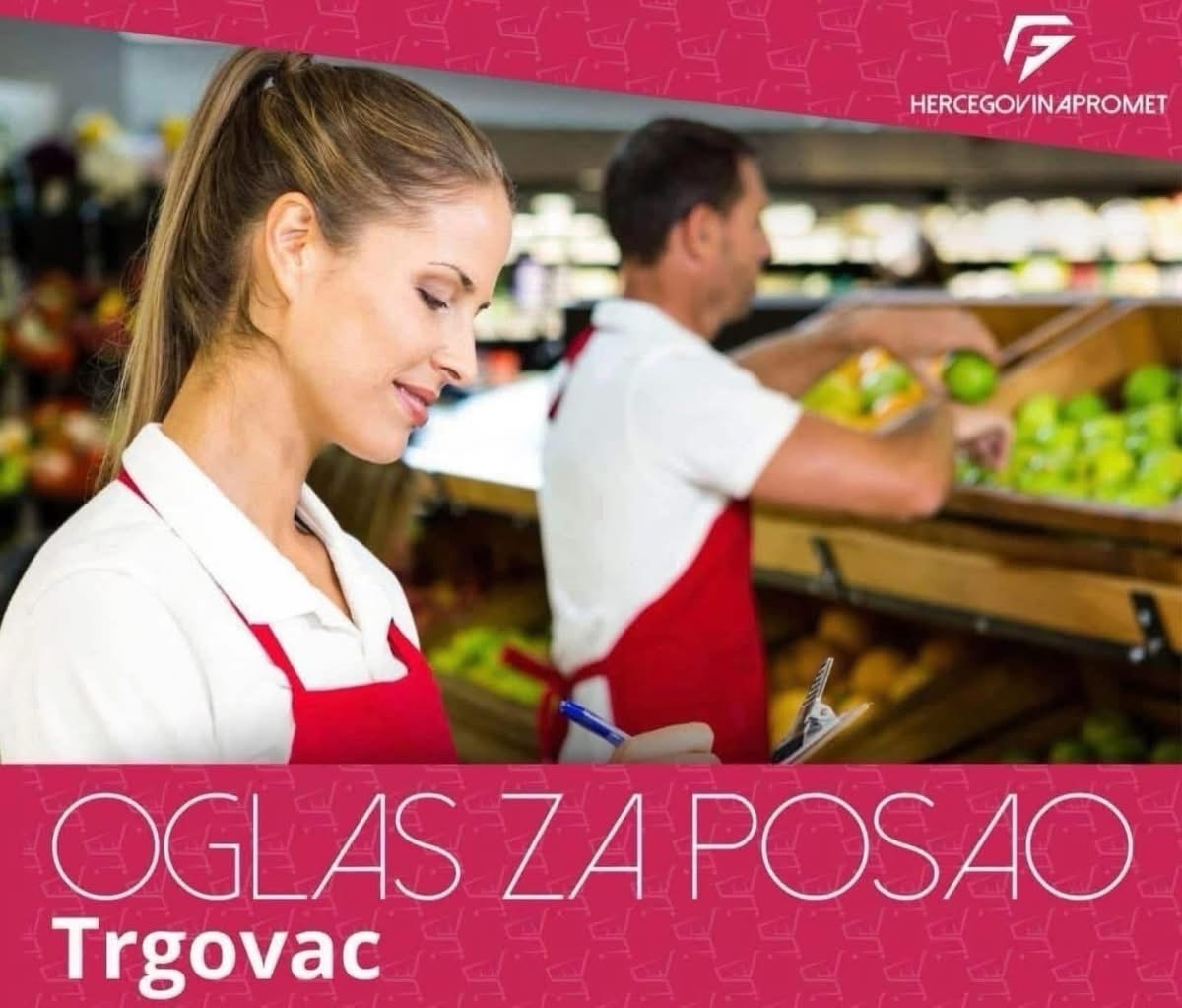 Kompanija Hercegovinapromet d.o.o. iz Mostara raspisala je oglas za prijem u radni odnos na više prodajnih lokacija, tražeći ukupno pet izvršilaca na poziciji trgovca.