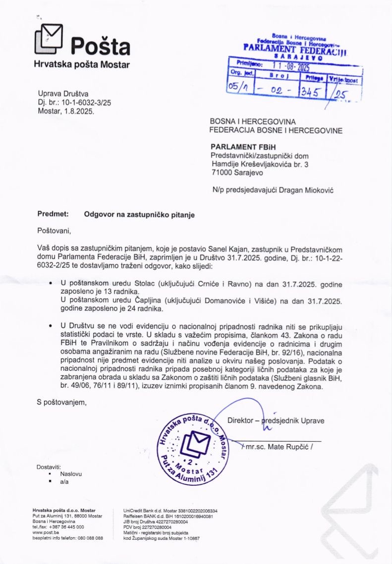 Službe Parlamenta Federacije Bosne i Hercegovine proslijedile su danas odgovore iz dvije javne kompanije u većinskom vlasništvu Federacije BiH – JP „Hrvatska pošta“ Mostar i JP „Elektroprivreda HZHB“ – na zastupničko pitanje federalnog zastupnika Sanela Kajana.