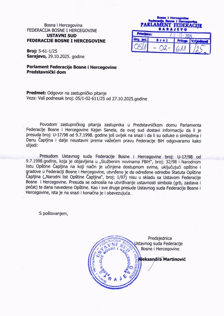 Posebno je ukazao na, kako tvrdi, nepoštivanje odluka Ustavnog suda Federacije BiH koje se odnose na gradska obilježja Čapljine. Prema njegovim riječima, gradska administracija i dalje koristi simbole koji su proglašeni neustavnim, čime se, smatra, narušava princip ravnopravnosti svih građana.