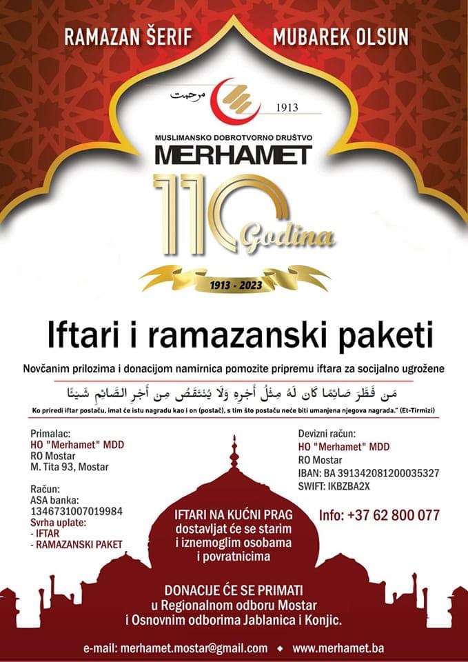 Dolazi nam dragi gost Mubarek Ramazan. Budite dio velike humanitarne priče, budite naši partneri i dobročinitelji u ovom odabranom mjesecu.