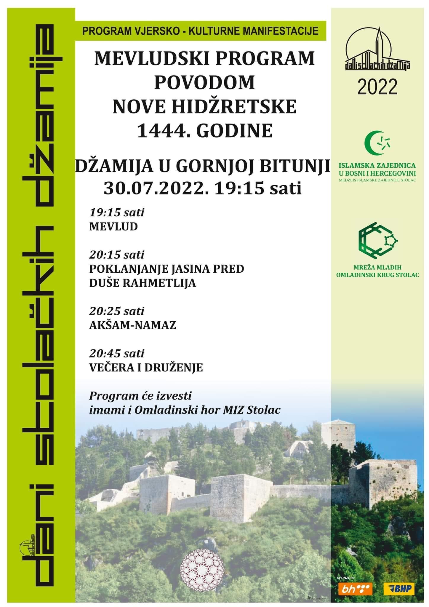 Mevludski program povodom nove hidžretske godine, subota 30.07.2022. u 19:15h, džamija u Gornjoj Bitunji. <img class="aligncenter size-full wp-image-18234" src="https://glasstoca.ba/wp-content/uploads/2022/07/0B317588-BFC8-4B0C-8674-3E6ACF3E99A6.jpeg" alt="" width="1448" height="2048" /><em>Bujrum!</em>