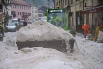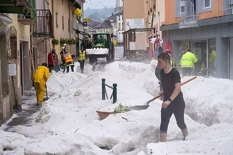 Francuski grad Plombieres-les-Bains pogodilo je jučer strahovito nevrijeme praćeno gradom zbog kojeg je lokalno stanovništvo lopatama i grtalicama za čišćenje snijega čistilo nanose leda sa ulica.