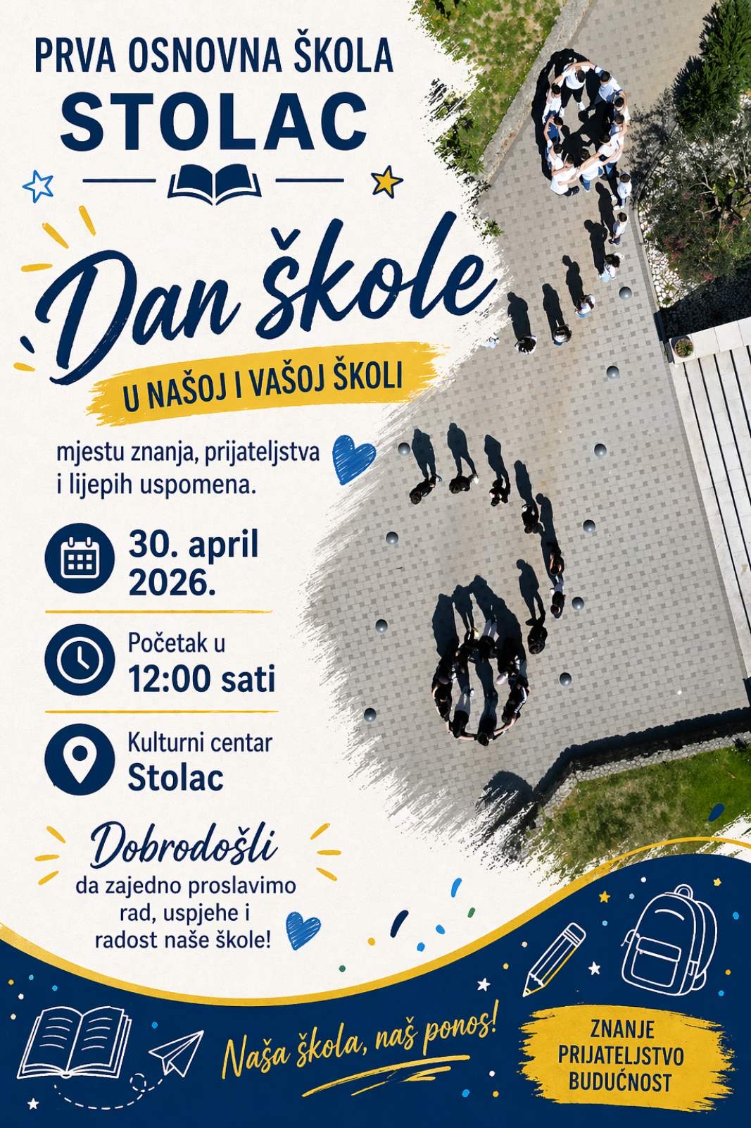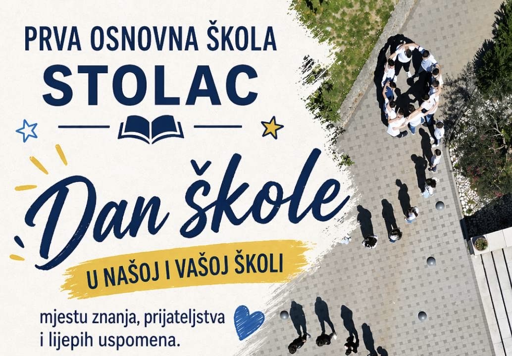 Povodom obilježavanja Dana škole, Prva osnovna škola Stolac organizovat će svečani program koji će biti održan 30. aprila 2026. godine u 12 sati u Kulturnom centru Stolac. Ovaj događaj bit će prilika da učenici, roditelji, nastavnici i prijatelji škole zajedno obilježe još jednu uspješnu školsku godinu ispunjenu znanjem, trudom i zajedništvom.