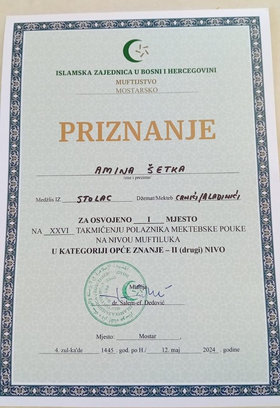 Amina Šetka je osvojila PRVO mjesto u kategoriji opšteg znanja – II (drugi) nivo i predstavljat će muftijstvo na nivou rijaseta .