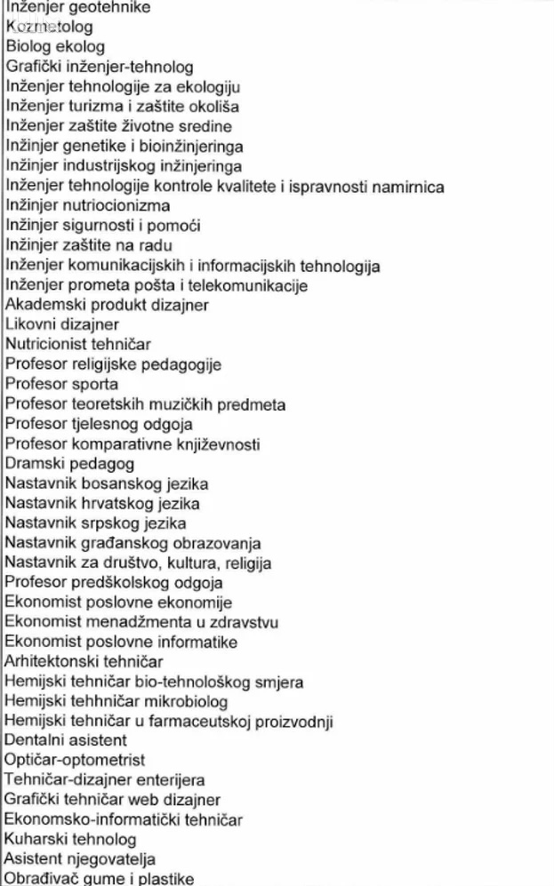 Tako će se, nakon današnje odluke Vlade FBiH, na spisku zanimanja naći, između ostalog inžinjer nutricionizma, profesor religijske pedagogije, nastavnik za društvo, kulturu i regiju, kuharski tehnolog, obrađivač gume i plastike i sl.