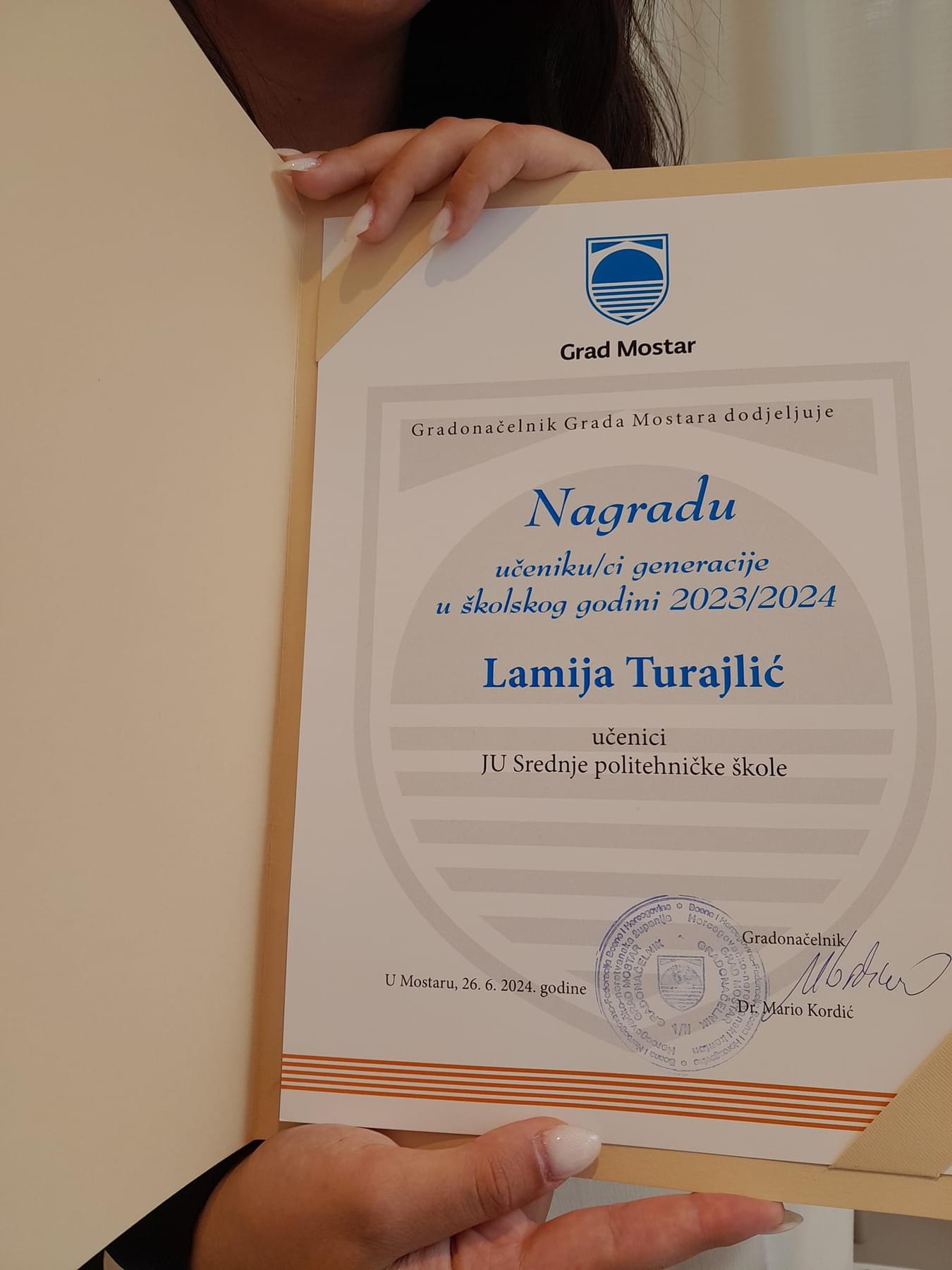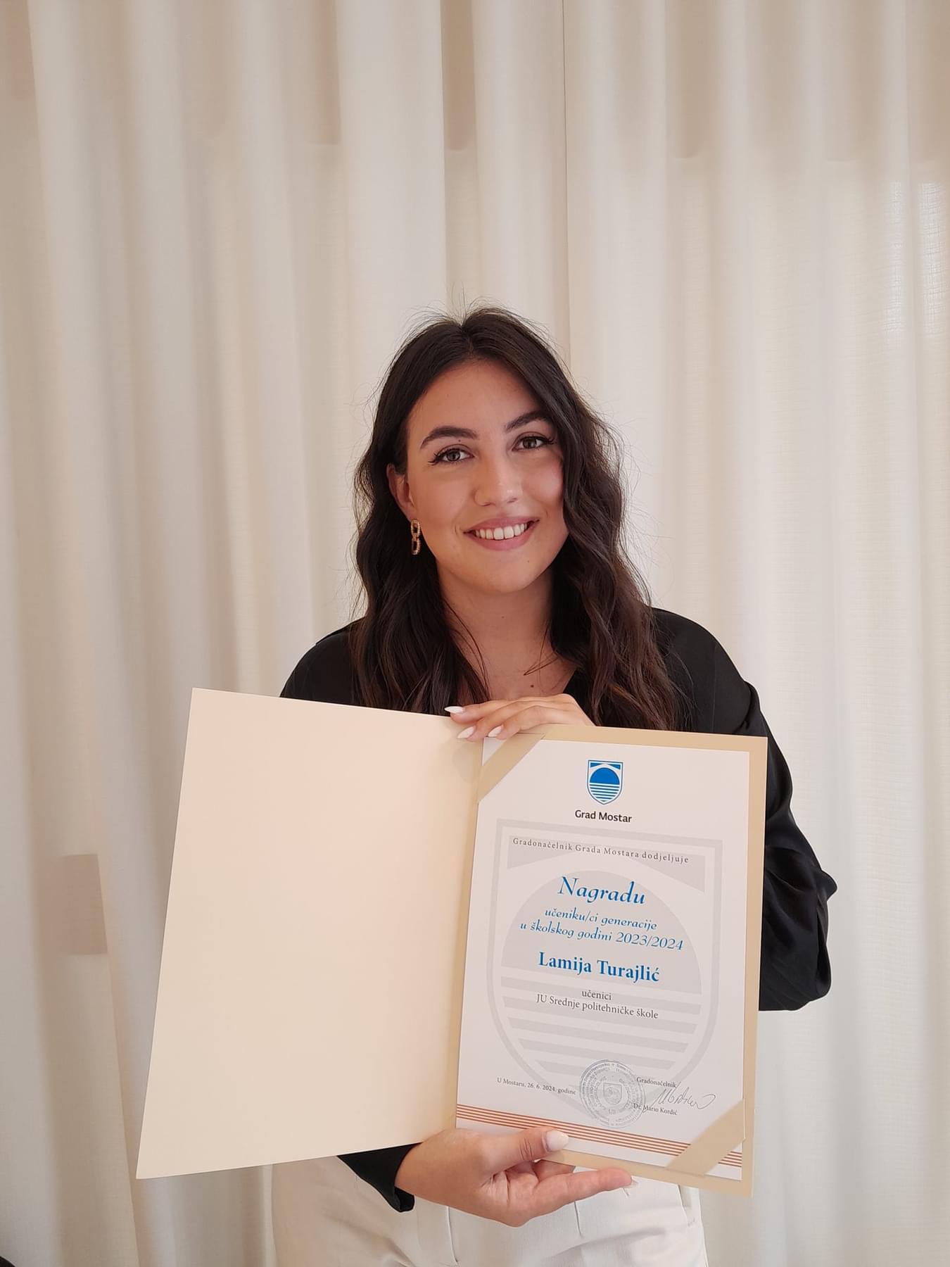 Učenica generacije JU Srednja politehnička škola, za školsku godinu 2023/2024 je naša Stočanka, Lamija Turajlić.