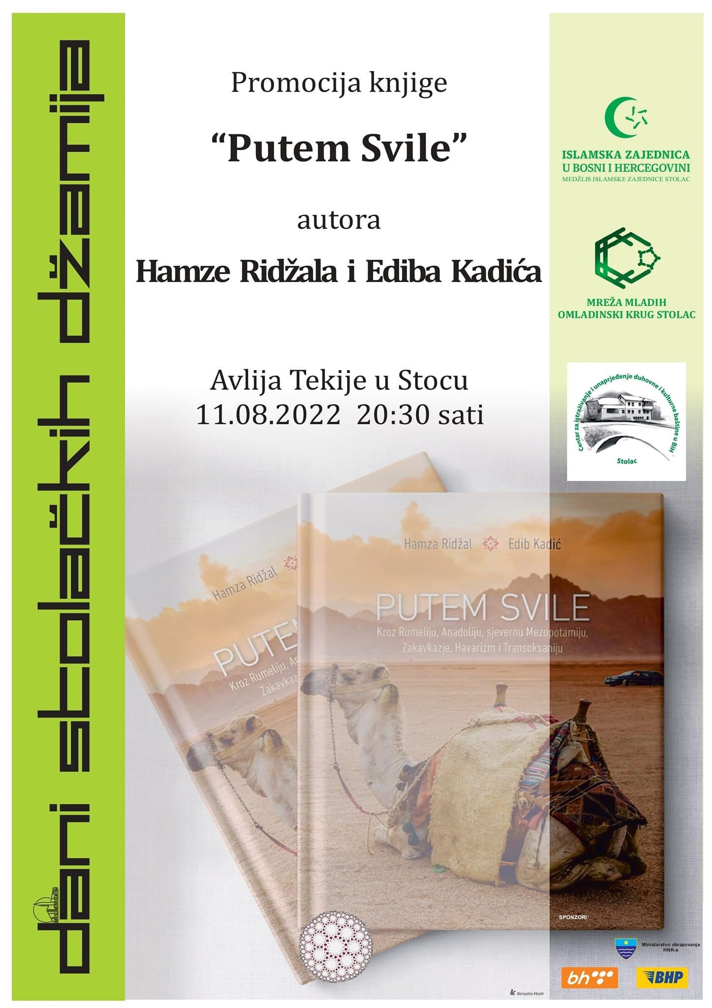 U četvrtak 11.08.2022. godine sa početkom u 20:30h u avliji Tekije u Stocu, Medžlis Islamske zajednice Stolac u sklopu manifestacije Dani stolačkih džamija 2022. godine organizuje promociju prvog bosanskohercegovačkog putopisa “Putem svile” autora Hamze Ridžala i Ediba Kadića.