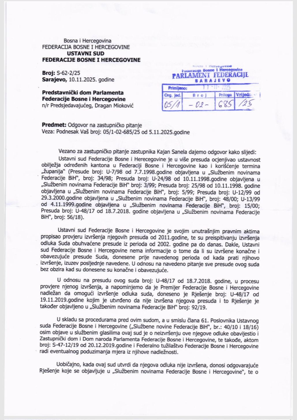 Zastupnik je istaknuo kako dijeli odgovor Ustavnog suda s javnošću i medijima „kao izraz transparentnosti svog zastupničkog rada i dosljedne borbe za ustavnost, jednakopravnost i poštivanje zakona u cijeloj Federaciji BiH“.