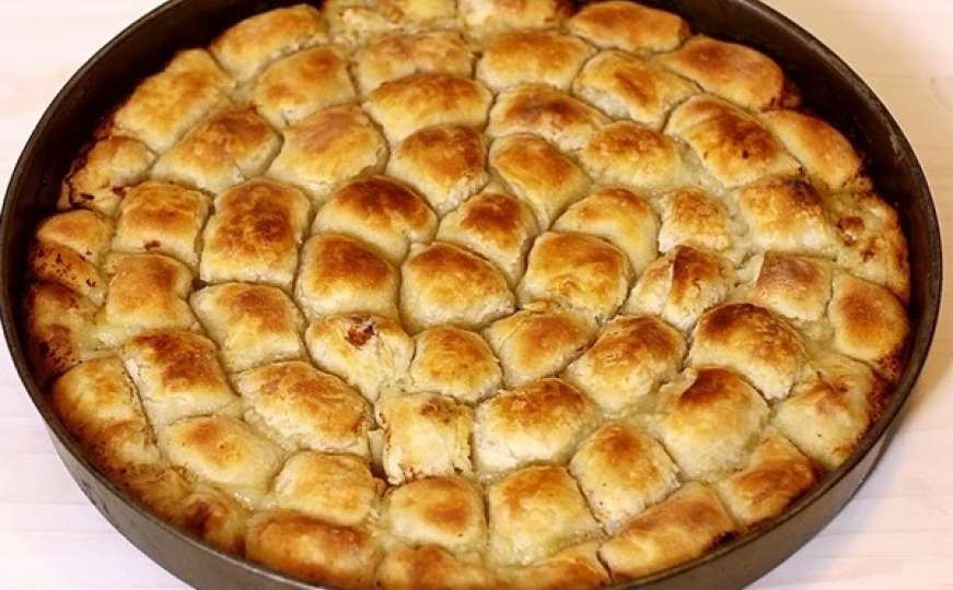 Podmazati pleh prečnika 35 cm pa slagati u krug isjeckane kvadratiće, jastučiće, pa premazati ih s ostatkom masla i ulja.