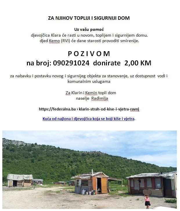 U naselju Radimlja kod Stoca, u improviziranoj kućici od najlona i dasaka, žive djevojčica Klara i njen djed Kemo – ratni vojni invalid. Njihova svakodnevica obilježena je strahom od kiše i vjetra, nedostatkom osnovnih uslova za život, ali i nadom da bolji dani mogu doći uz pomoć dobrih ljudi, piše Glasstoca.ba.