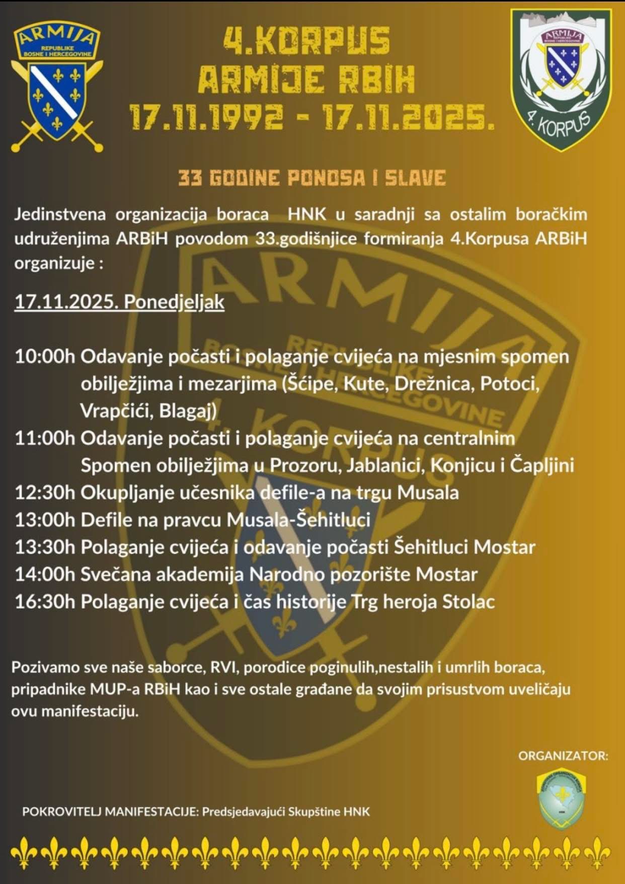 Manifestacija obilježavanja 33. godišnjice formiranja 4. korpusa Armije Republike Bosne i Hercegovine, koja će se održati 17. novembra 2025. godine, završit će u Stocu, na Centralnom spomen-obilježju „Trg heroja“.