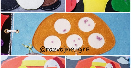 Cifom zatvoren pretinac dijete treba samo otkopčavati i zakopčavati, čime se potiče mikromotorika i samostalnost. Iz pretinca tada možemo izvaditi krugove sa znakovima. S krugova je potrebno pročitati znakove i upariti ih s količinama perlica u mrežicama, te tada nasložiti krugove na gljivu. Druga aktivnost s krugovima je stvaranje brojnog niza – slažući brojeve u niz stvaramo gusjenicu! Ovo je vrlo kreativan način prikaza brojnog niza!